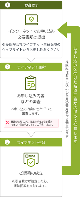 ウェブサイトからお申し込みいただき、引受保険会社ライフネット生命にて審査が完了してご契約が成立した後、お申し込み時点にさかのぼって保障を開始します。